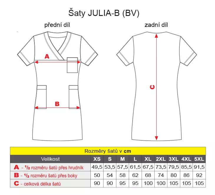 Zdravotní šaty dámské Julia-B tyrkys/bílá s mírně vypasovaným střihem a oblékáním přes hlavu, na předním díle 3 nakládané kapsy a sedlové členění, barevné zdobení na krátkých rukávech a výstřihu, zadní díl hladký, dolní kraj je rovný s krátkými bočními rozparky. Materiál: 100% bavlna, sanfor., merc. 160g/m2. Praní: na 60°C.