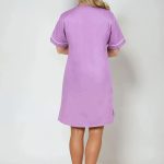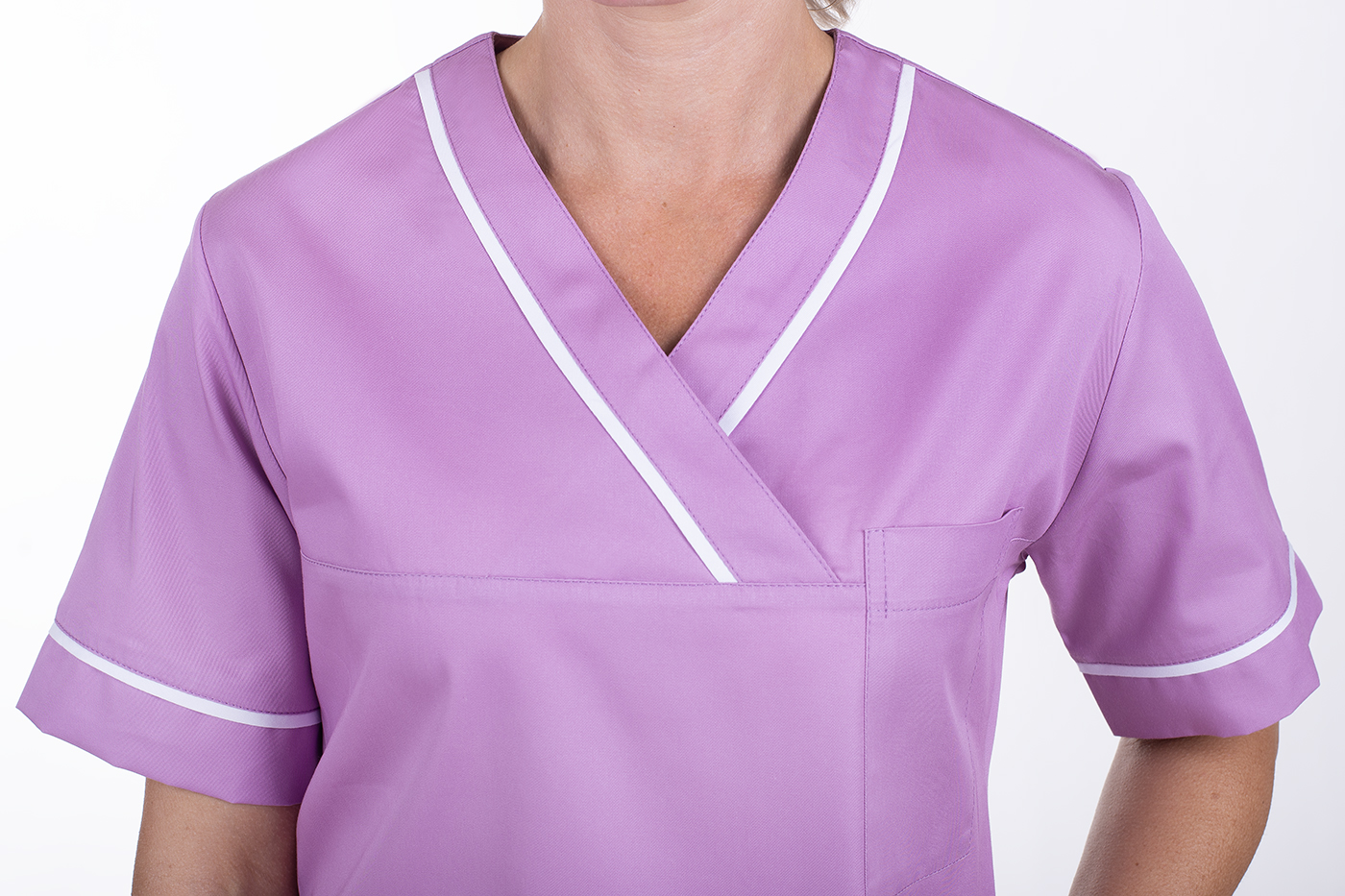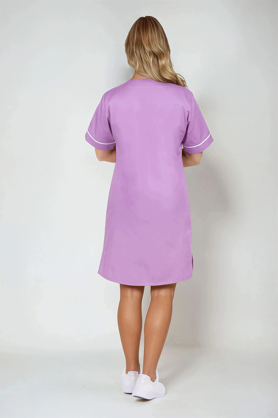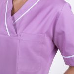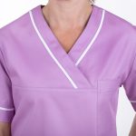 Barevné provedení ve svěží kombinaci fialové a bílé působí pozitivně, moderně a zároveň decentně. Fialová barva není v nemocničním prostředí obvyklá, a právě proto může přispět k příjemnějšímu vizuálnímu dojmu, ať už z pohledu kolegů nebo pacientů. Barevné kontrasty navíc podtrhují detaily střihu a dodávají šatům osobitý ráz.