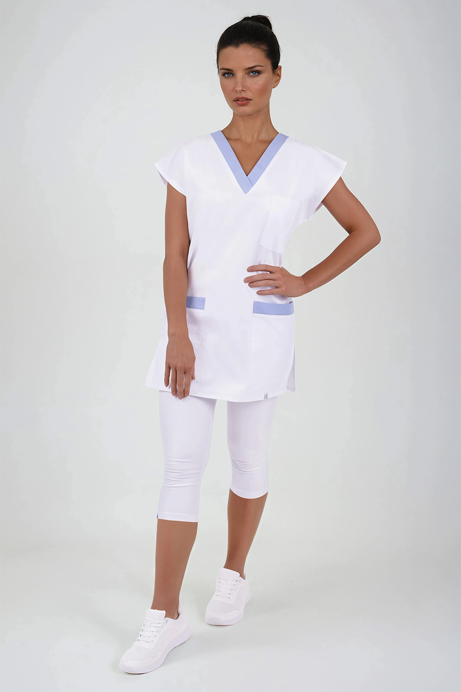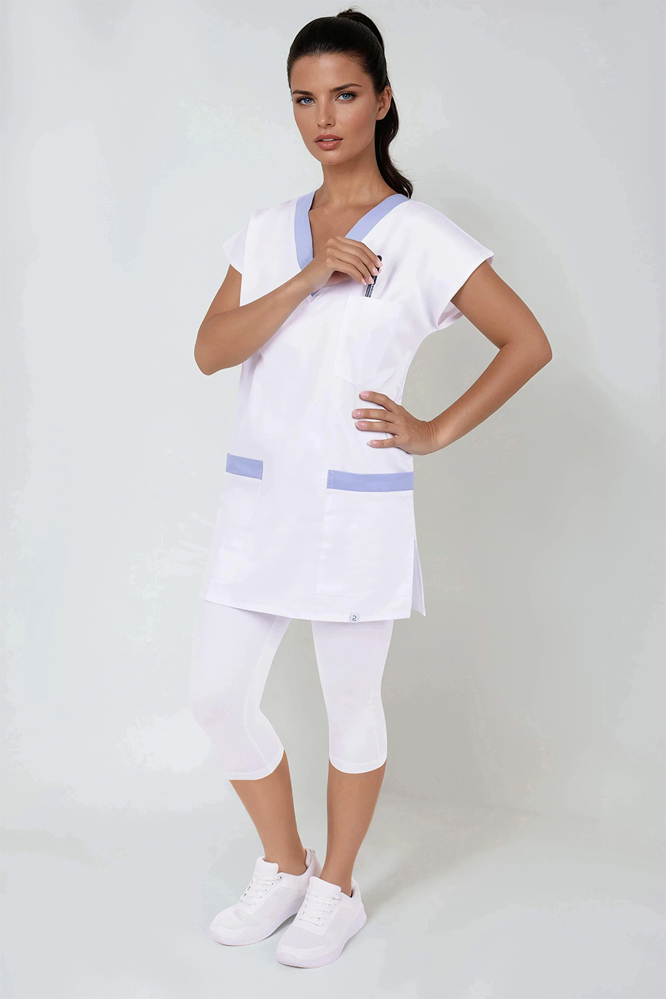 Výstřih do „V“ působí moderně a profesionálně, navíc opticky prodlužuje krk a odlehčuje vzhled. Dvě praktické spodní kapsy a jedna náprsní kapsa poskytují dostatek úložného prostoru pro nezbytnosti – od propisek přes telefon až po lékařské pomůcky, jako jsou fonendoskopy, kapesní zápisníky nebo jednorázové rukavice.