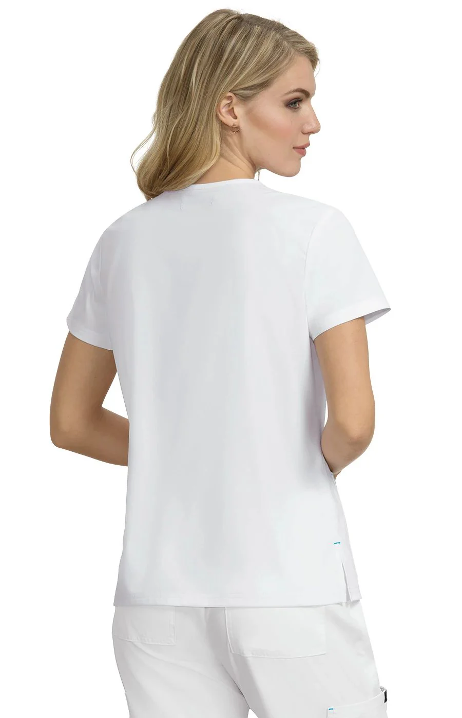 Zdravotnické haleny Becca v bílé barvě, s klasickým výstřihem do V, lehká tkanina odvádějící vlhkost, 4 kapsy včetně skryté kapsy na mobil s potiskem podšívky, pružná smyčka pro uchycení jmenovky, kontrastní potisk na spodní straně lemu krku, lehký strečový materiál, který není nutné žehlit, vícestehové prošívání ve švech pro delší životnost oděvu. Materiál: 95% polyester + 5% spandex. Praní: na 30°C.