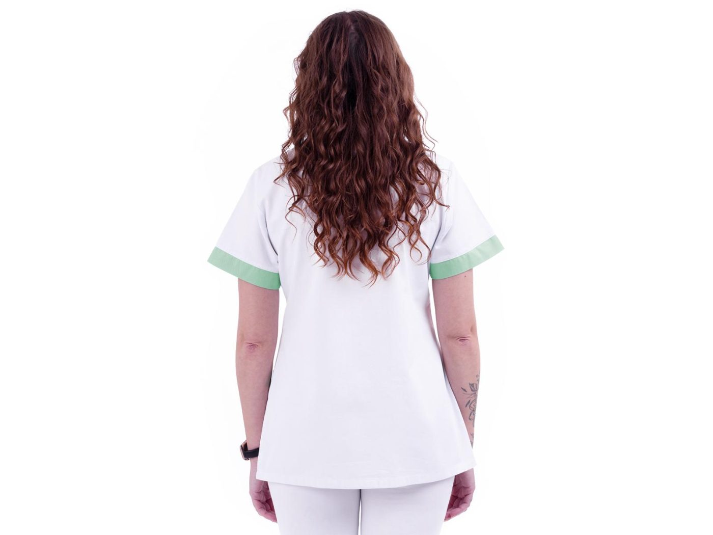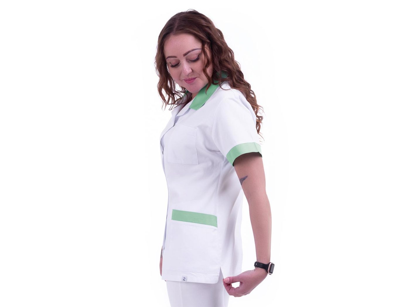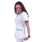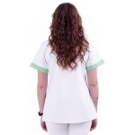 Dámská pracovní halena Evelin bílá/mentol s rozhalenkou má lehce projmutý střih, zapínání na kovové stříbrné druky, 3 praktické kapsy. Materiál: 100% bavlna 160g/m2. Praní: na 60°C.