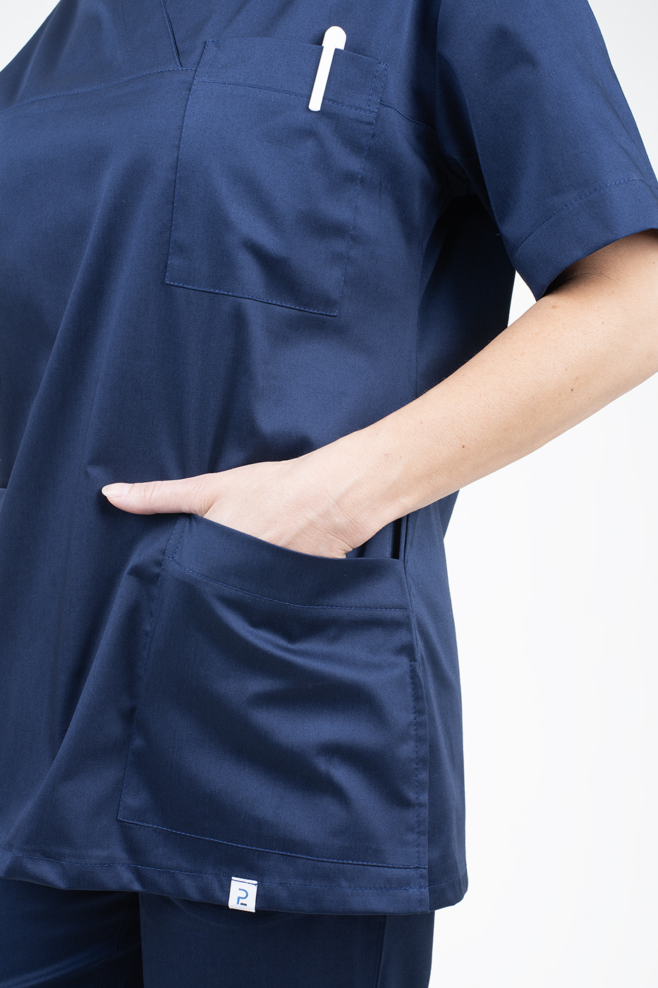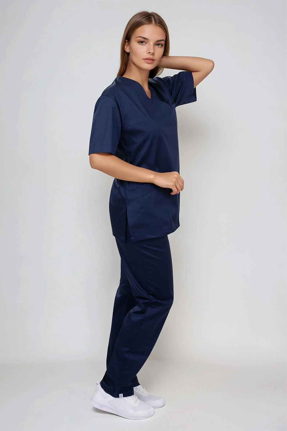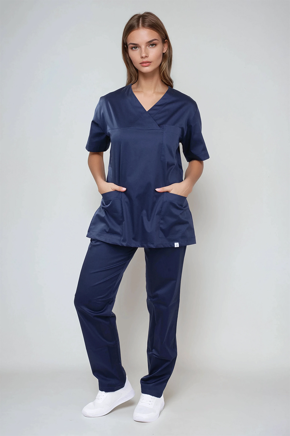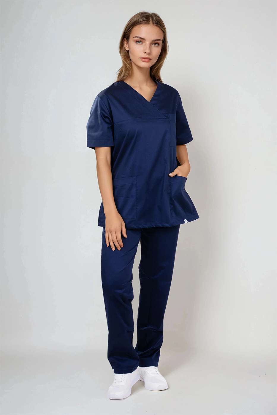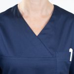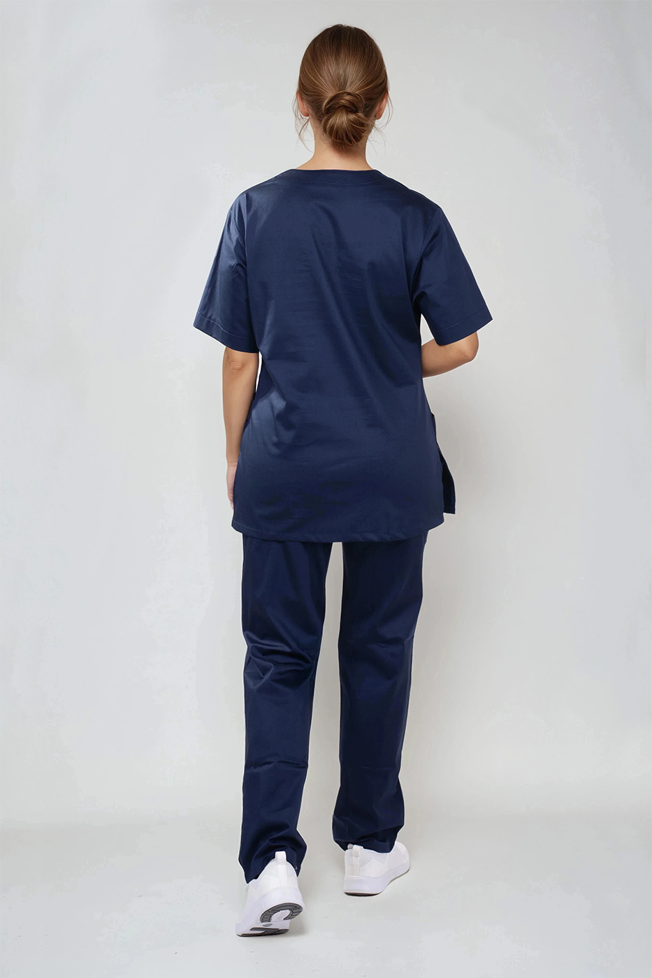 Tmavě modrá barva působí seriózně, profesionálně a zároveň elegantně. V kombinaci s kvalitním bavlněným saténem vytváří oděv, který splňuje všechny požadavky moderní zdravotnice – od hygieny přes pohodlí až po reprezentativní vzhled.