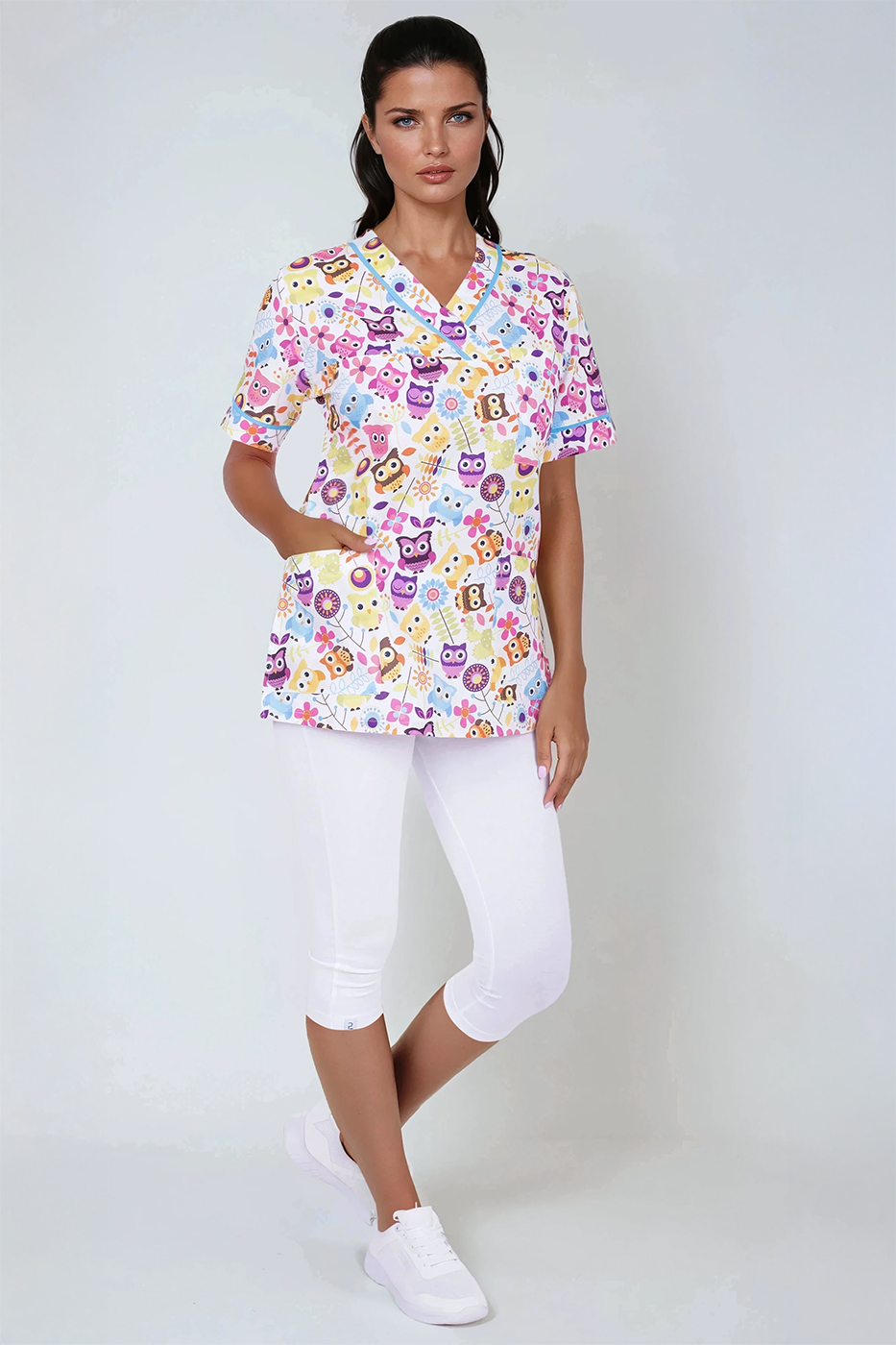 Tato halena je navržena pro ženy, které hledají kvalitní a pohodlný pracovní oděv s osobitým vzhledem. Motiv soviček v pastelových tónech působí pozitivně a přátelsky, a je obzvlášť oblíbený v dětských ordinacích, na pediatrii, v nemocnicích, lékárnách nebo domovech pro seniory. Zároveň je však dostatečně vkusný a decentní, takže se halena hodí i do běžného zdravotnického provozu či kosmetického nebo wellness prostředí.