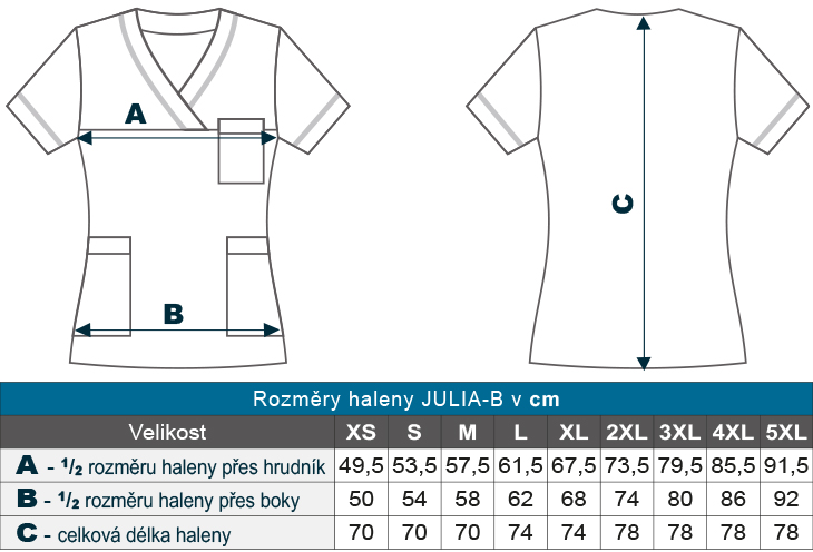 Halena Julia-B Sovičky má moderní projmutý střih, který lichotí ženské postavě, a přesto nikde netlačí ani neomezuje v pohybu. Krátké rukávy zajistí volnost v oblasti ramen, což oceníte zejména při práci s pacienty, manipulaci s nástroji nebo v rychlém pracovním tempu.