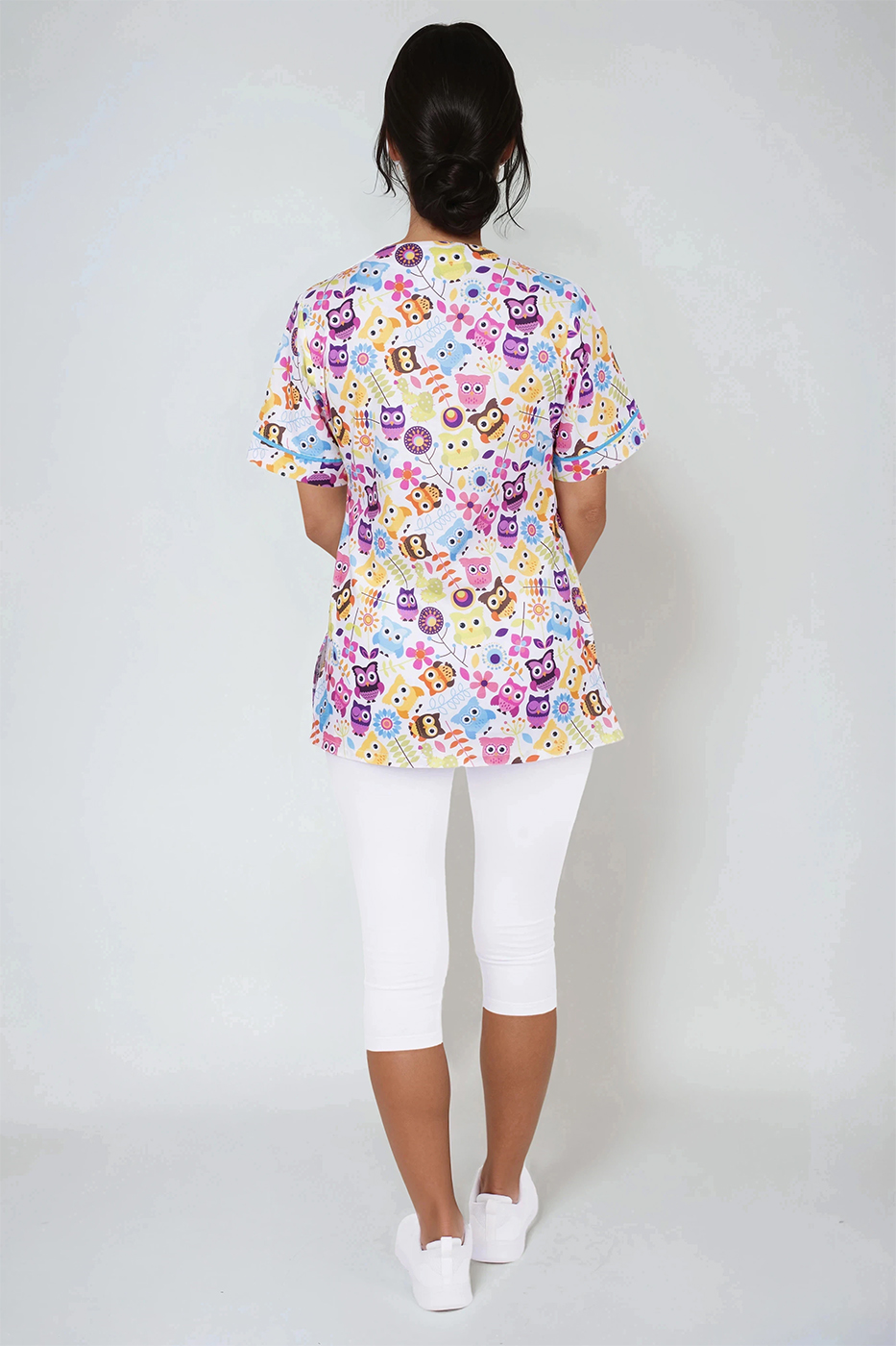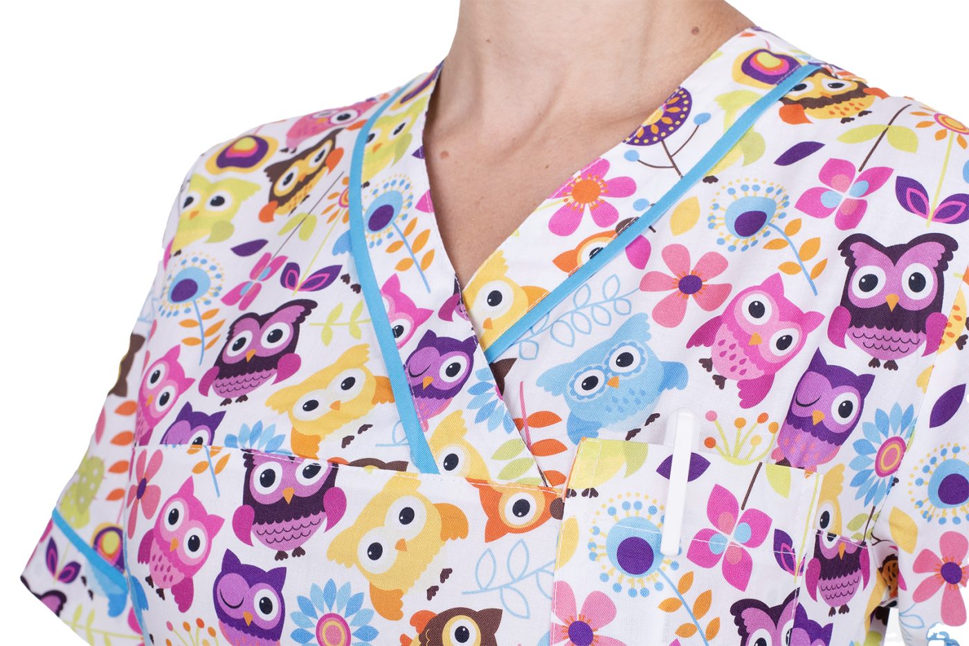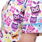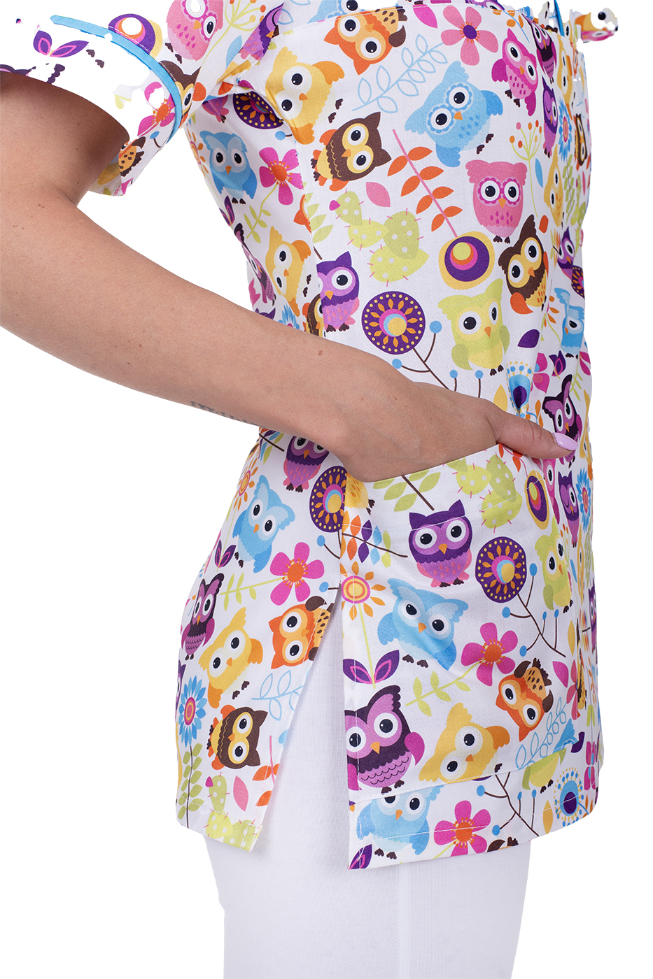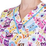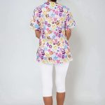 Zdravotnická halena Julia-B Sovičky je moderní a velmi pohodlný pracovní oděv, s originálním digitálním potiskem květů, halena je mírně vypasovaného střihu s výstřihem do V, na předním díle se 3 prostornými kapsami, v bočním švu je opatřena krátkými rozparky pro svobodnější a ještě více uvolněný pohyb. Materiál: 100% bavlna, 150g/m2, digitální potisk.