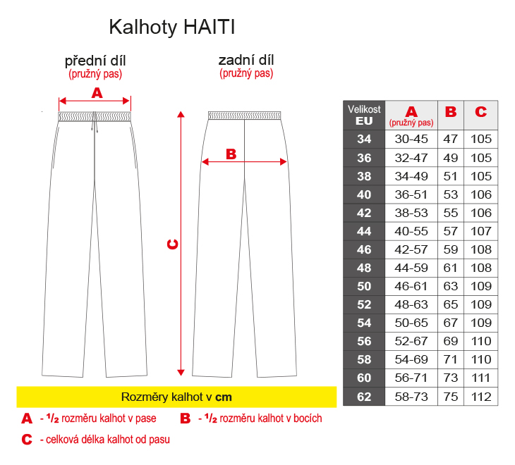 Zdravotnické kalhoty na gumu dámské Haiti mají moderní sportovní střih se sníženým pasem. Že vám kalhoty budou dobře držet zajistí 2 vyměnitelné gumy a 1 šňůrka. Materiál: 100% bavlna, sanfor., merc. 200g/m2. Praní: na 95°C.