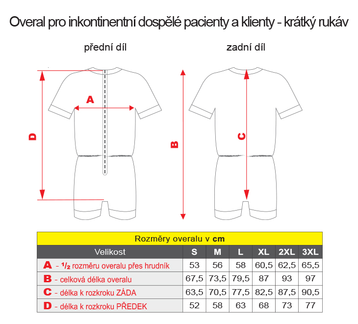 Overal pro inkontinentní dospělé pacienty a klienty s krátkými rukávy uvítají ošetřovatelé v domovech důchodců, pečovatelských ústavech a všech zařízeních, která pečují o tyto klienty. Praktický suchý zip v rozkroku usnadňuje manipulaci s overalem. Materiál: zdravotně nezávadná 100% bavlna, možnost praní na 95°C.